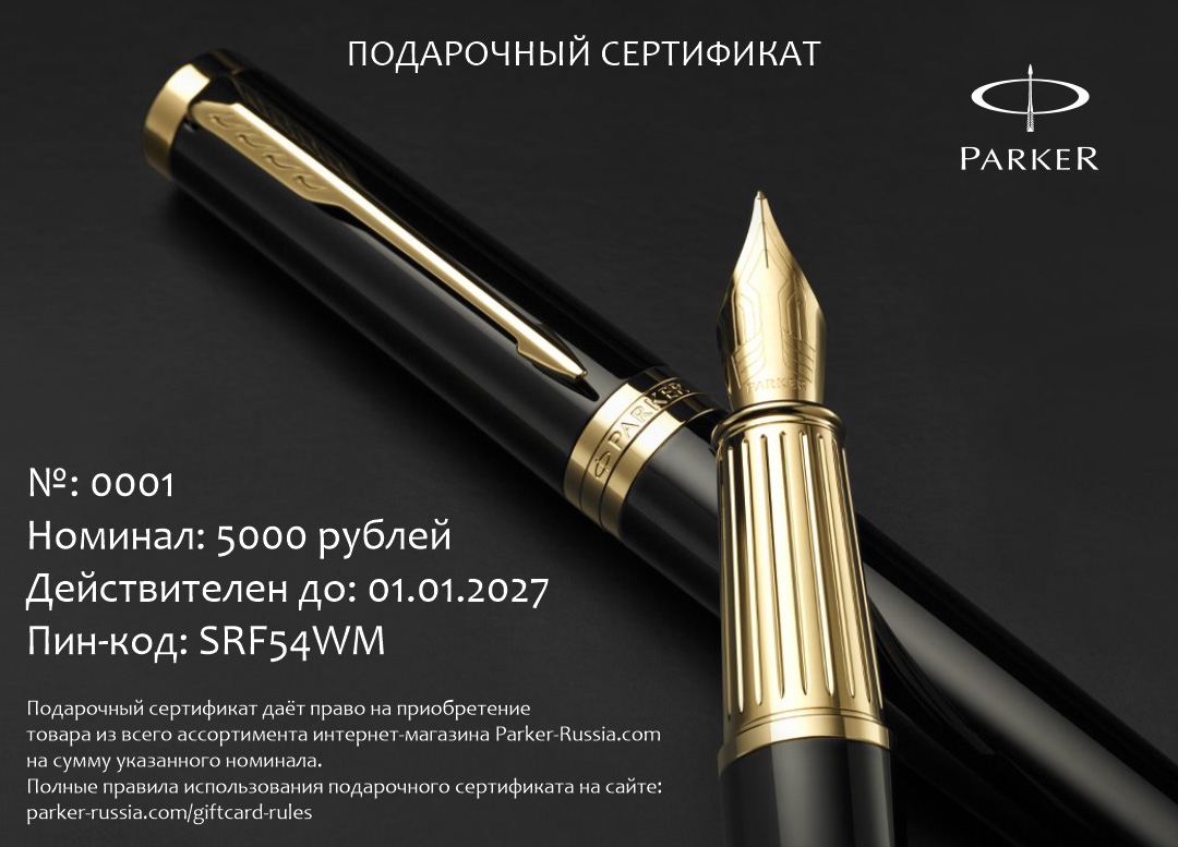 Подарочный сертификат Parker 5000 от официального дилера Parker в Шахтах. Вы можете дополнительно заказать гравировку, которая подчеркнет Вашу оригинальность и придаст памятность статусному подарку. Все ручки Паркер поставляются в фирменном футляре.